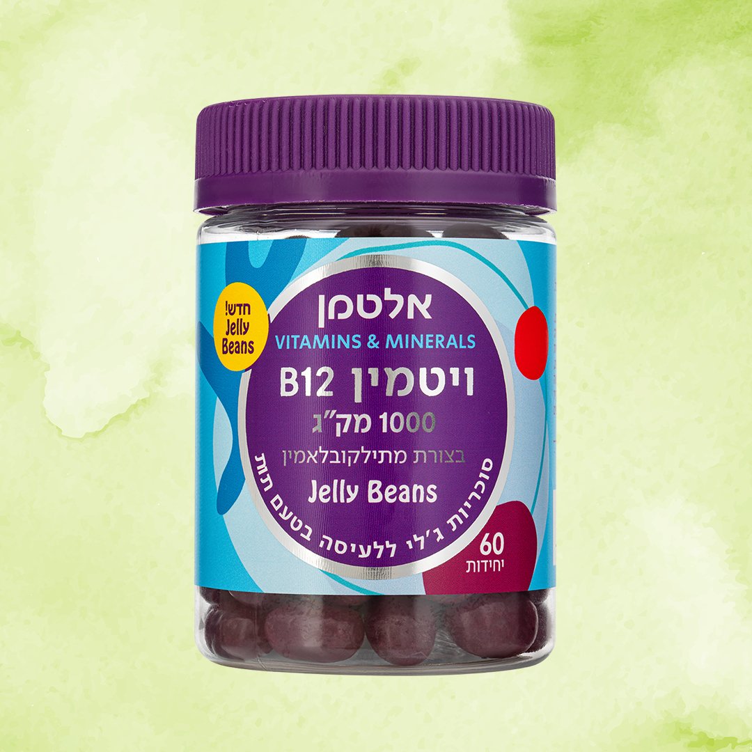 מוצר חדשני בצורת Jelly Beans ללעיסה בטעם תות, המכיל 1000 מק”ג ויטמין B12 (מתילקובלאמין פעיל), בפורמט טבעוני וטעים במיוחד, ללא צבעי מאכל מלאכותיים.