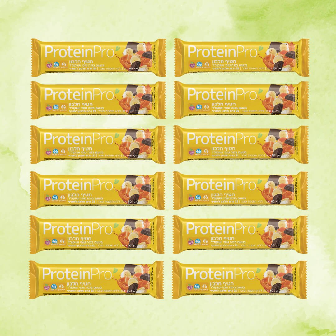 חטיף חלבון טבעוני בטעם בננה, טופי ושוקולד, המכיל 21 גרם חלבון איכותי בכל חטיף.