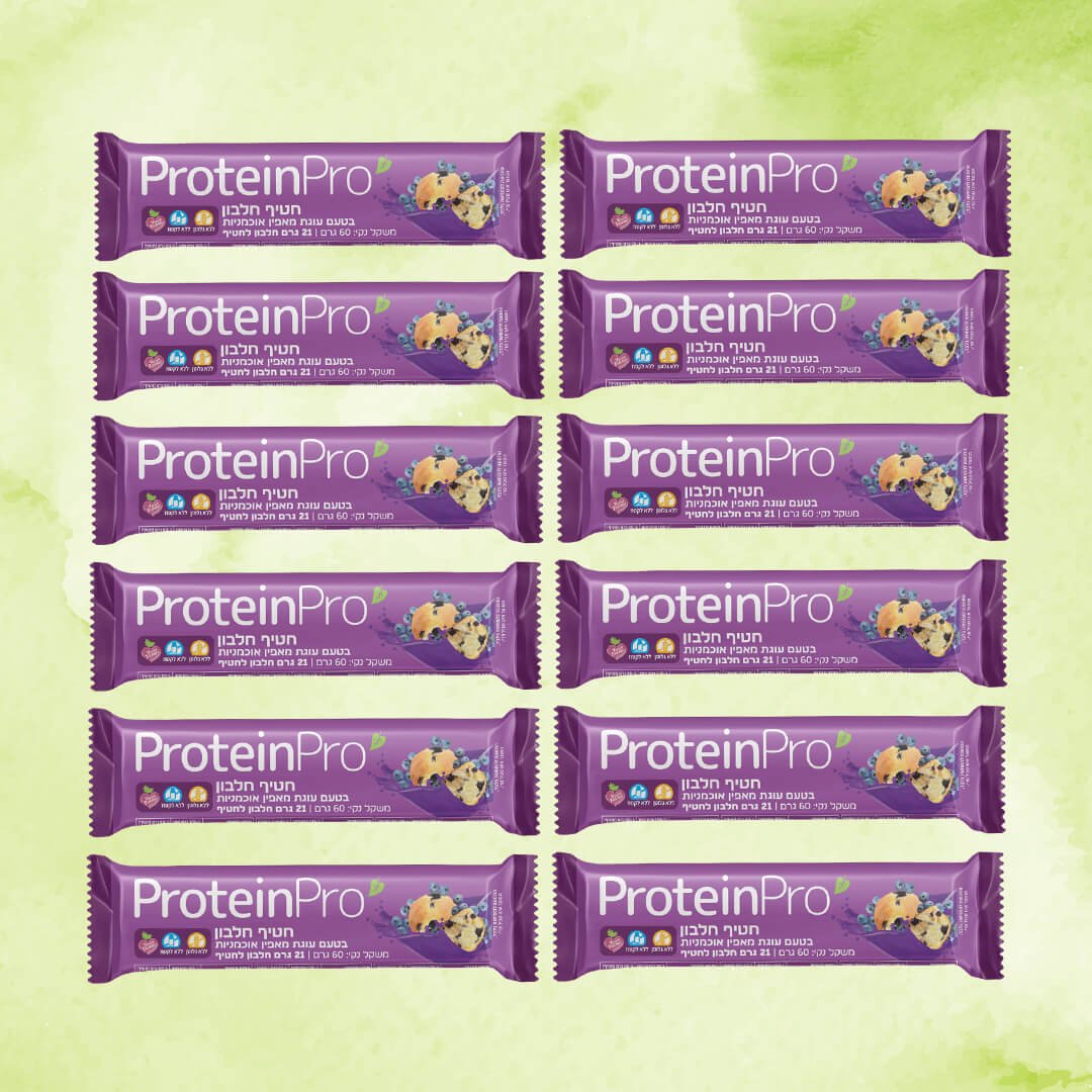 חטיף חלבון טבעוני בטעם עוגת מאפין אוכמניות, המכיל 21 גרם חלבון איכותי בכל חטיף.
