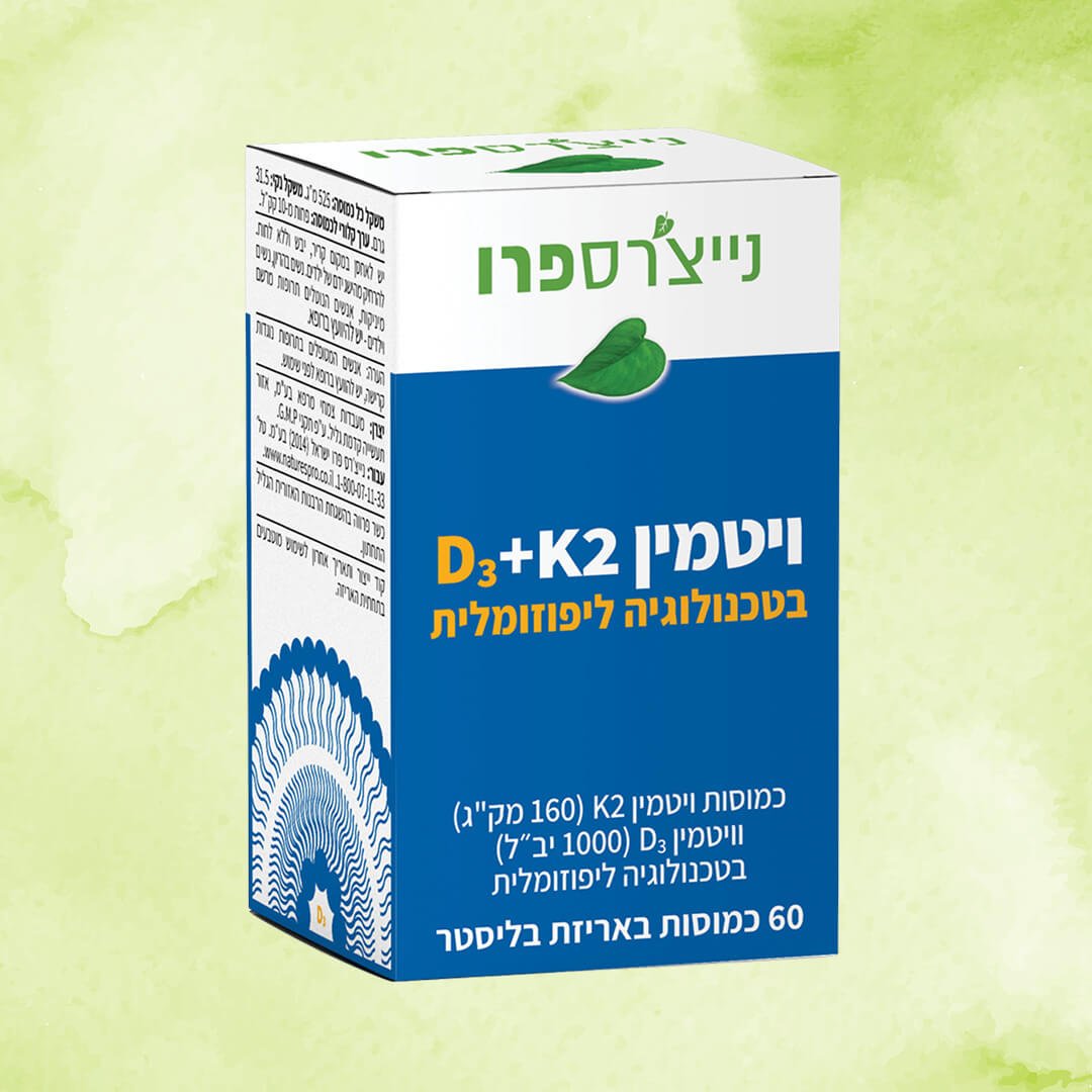 ויטמין D3+K2 של נייצ’רס פרו הוא תוסף תזונה המשלב ויטמין D3 (1000 יחב”ל) וויטמין K2 (160 מק”ג) בטכנולוגיה ליפוזומלית, המיועדת לשיפור הספיגה והזמינות הביולוגית של הוויטמינים בגוף.