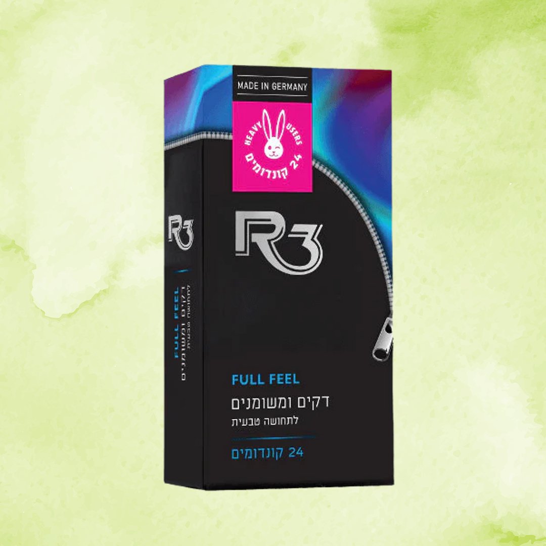 קונדומים R3 מדגם Full Feel מיועדים למי שמחפש תחושה טבעית יותר בזמן השימוש. הקונדומים דקים ומשומנים, ומגיעים באריזה של 24 יחידות.