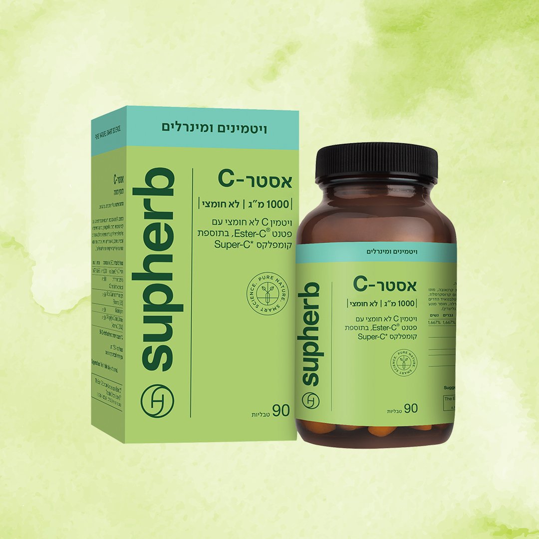 ויטמין Ester-C קומפלקס 1000 מ״ג מבית Supherb מבוסס על צורת ויטמין C מתקדמת ולא חומצית (Ester-C®), המאפשרת ספיגה גבוהה ושמירה ממושכת של הויטמין בגוף.