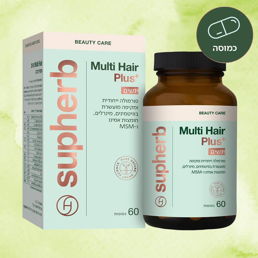 מולטי הייר פלוס לנשים של סופהרב היא פורמולה ייחודית ומקיפה לטיפוח השיער, המשלבת רכיבי תזונה חשובים לשמירה על שיער בריא וחזק. הפורמולה מכילה ויטמיני B, ויטמין C, אבץ, ביוטין, סיליקה, יוד, MSM וחומצות אמינו, המעניקים תמיכה תזונתית לשיער.