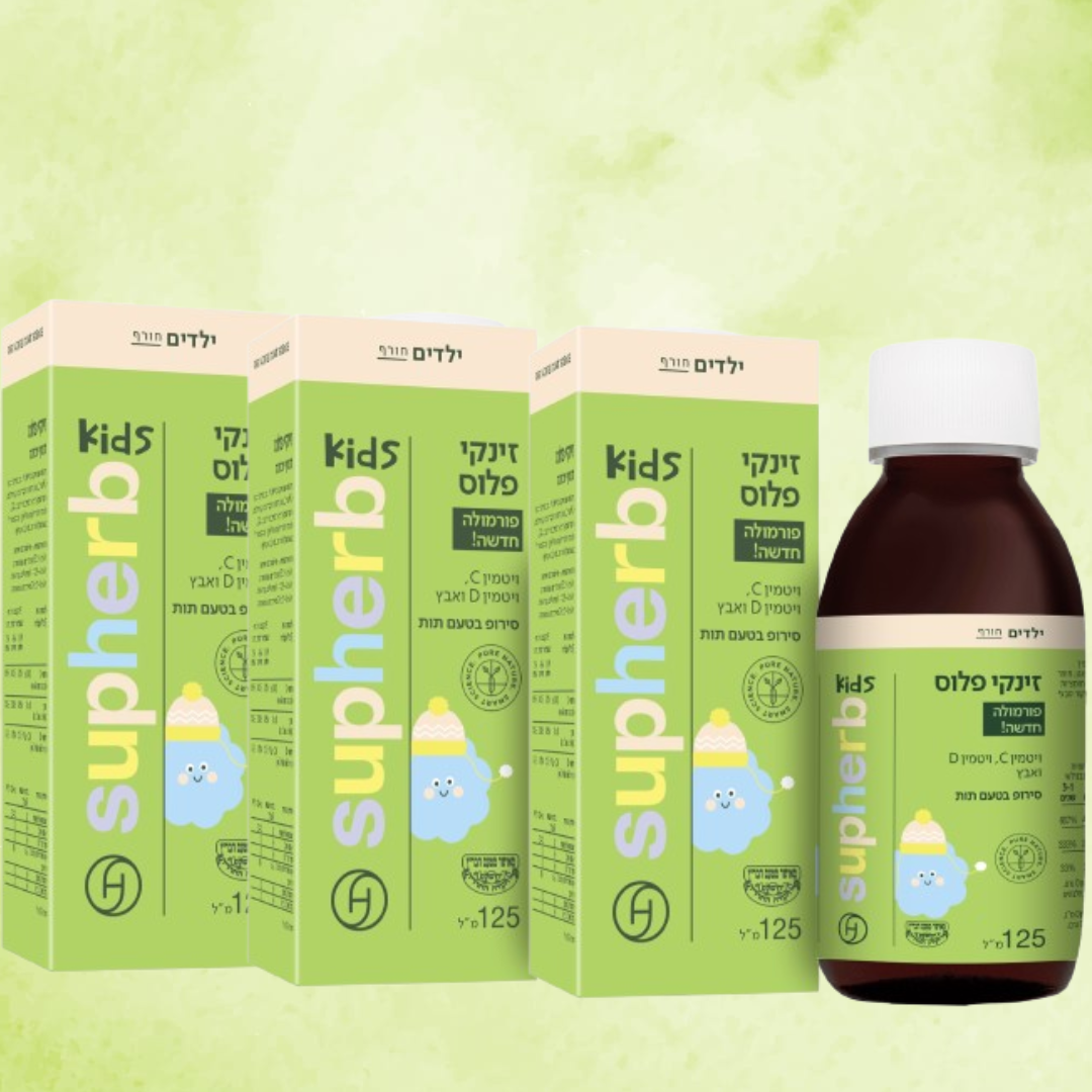 זינקי פלוס לילדים – סירופ בטעם תות עם ויטמין C, ויטמין D ואבץ, לחיזוק מערכת החיסון בחורף. מתאים לילדים מגיל 4, ללא סוכר, קל לשימוש וטעים במיוחד.